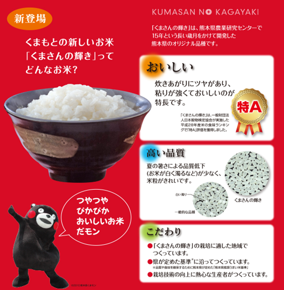 また、「くまさんの輝き」は、県が定める「熊本県推奨うまい米基準」に基づき一定の水分やタンパク質含有率をクリアしたもののみをロゴマークのついた米袋で販売しています。この赤い袋がおいしい証です。