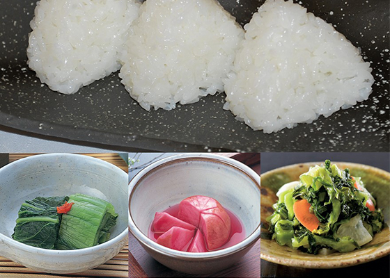 「雪若丸」の塩むすびと、山形の「青菜漬」、「赤かぶ漬」、「おみ漬」などをごはんのお供としたシンプルな組み合わせもマッチします。