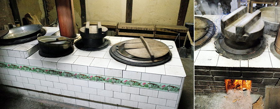 「竈の家」にあるのは、レンガの土台にタイル貼りの西洋クド(クド=かまど)。元々この家にあった土クドを、大正~昭和初期に造り替えたものだそうです。当時は珍しかった白いタイル(黒タイルが一般的)にアザミの飾りタイルをあしらうなど、なんともお洒落なキッチンです。鍋釜を据える釜口は、右からハソリ(大鍋)用、炊飯釜用、ステクド(余熱で沸かす茶釜)、さらに大きなハソリ用の4つ。釜輪という鋳物の輪を設置して釜口の直径を調整することで、さまざまなサイズのお鍋を使えるようになっています。