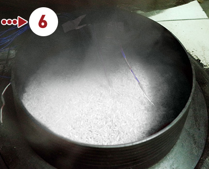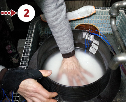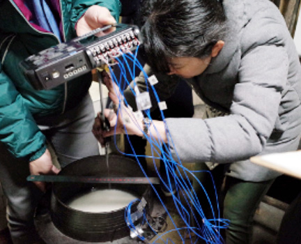 釜の温度を測るための器具を装着。炊き始めから炊きあがりまで、釜の内側・外側の上下各所を測定します。
