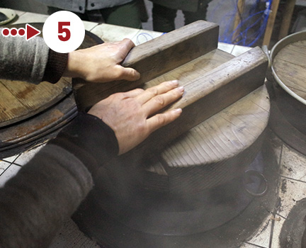 ザルで水をよく切ったお米を釜に入れ、水を注ぎます。使い込まれた鉄の釜には目盛りがなく、また計量カップも使いません。「手のひら全体がかぶるぐらい」を目安に、水量を調整します。