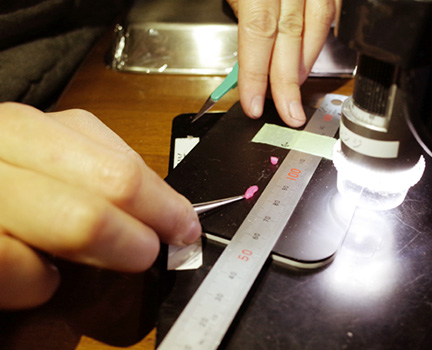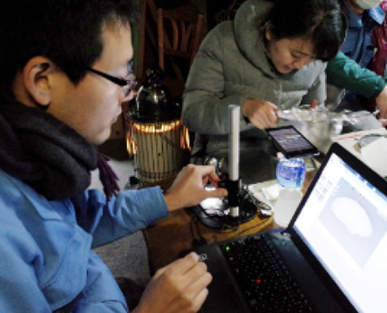 炊きあがったお米の検証。マイクロスコープを使って、保水膜の状態を観察します。