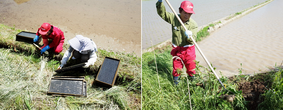 田植えまでの1か月間、苗を育んできた苗箱の役目はいったんここで終了。来年の育苗の時期までお休みです。その働きを労るように、田んぼの用水路で苗箱を水洗いする青木。陽の光を浴びて、用水路の水面もキラキラと輝いています。