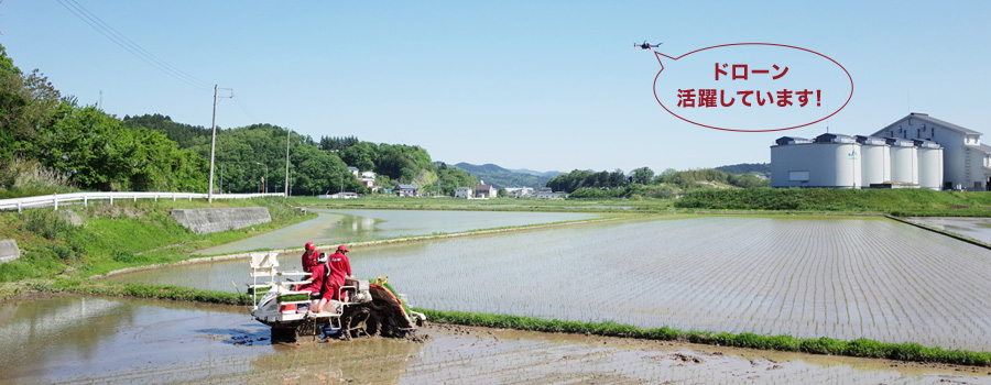 - 昔は田んぼに糸を張って、その間をまっすぐ手植えしながら進んでいたんですよ。それに比べれば、今は機械で作業できるからずいぶんラクになった。今や、ドローンを使って種まきや肥料やりをする方法もあるくらいですからね。