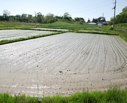 - 水がいいから、お米もおいしく育つんですね。用水路の清流もそうですが、田んぼに張られた水も鏡のように澄んでいてきれいですね。