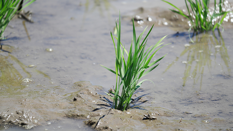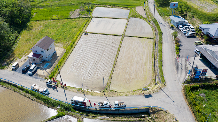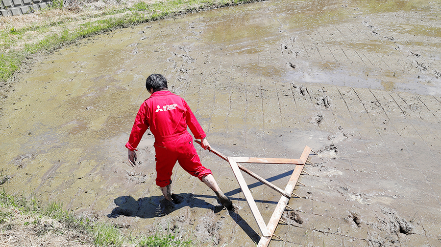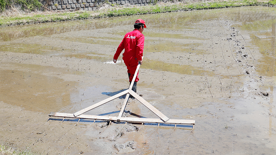 代(しろ)かき~田植えが近くなると、水田の土壌をより均質に、そして水平にするために行われるのが「代かき」です。水田は一見平らに見えますが、実は水面下では細かな凹凸があり、地形によっては傾斜になってしまうことも。代かきができていないと、田植え機でもまっすぐ植えにくくなり、手植えでは植えるのが難しい場所も生まれてしまいます。
