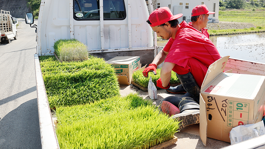 さていざ田植え!となると苗が必要です。現代では農協などが手がける育苗センターで苗を購入する農家も多いと言いますが、自ら育苗も手がける木村さんは自分の育苗センター(!)を所有していて、軽トラックでぎっしりと苗の敷き詰められた苗箱を運んできました。