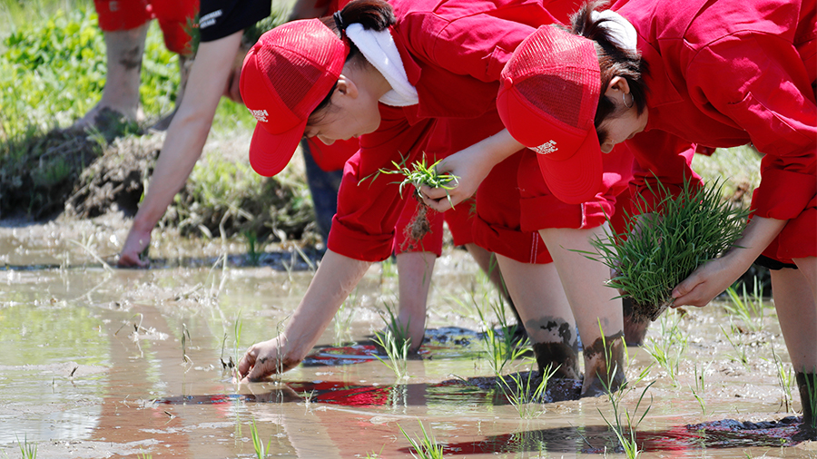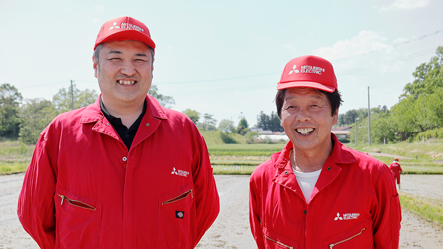 三菱電機のフラッグシップ炊飯器「本炭釜 KAMADO」にまつわる社内横断チーム。田んぼ歴10年以上のベテランもいるが、「田んぼに入るの、初めて!」という初心者も。素朴な視点と疑問を携えて登米の地にやってきました。