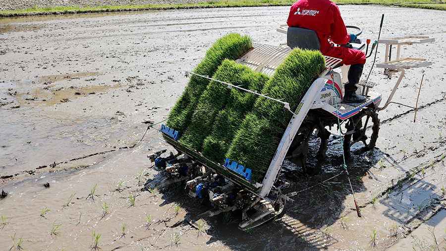 田植えはね。植える前も大事なの。田んぼを起こして、雑草を引いた後の代かきがうまくできると田植えも水の管理もラクになる。最初の肥料やりで土をしっかり作るのも代かきの大切な役割なんです。