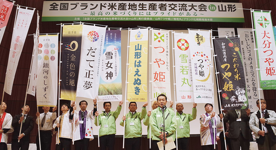 2019年11月12日、山形市にある山形テルサで開催された「全国ブランド米産地生産者交流大会in山形」。北海道から九州まで、全国の米産地生産者が一同に集まりました。全国規模のお米の産地交流会は、今までにない初の試みとのこと。主催は、「全国ブランド米産地生産者交流大会」実行委員会・山形「つや姫」「雪若丸」ブランド化戦略推進本部。