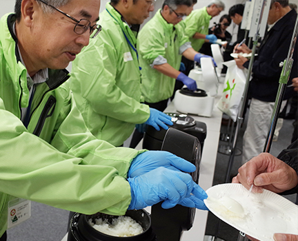 「ブランド米試食コーナー」では、三菱ジャー炊飯器<本炭釜 KAMADO>(NJ-AWA10)で炊いた、炊き立ての新米ごはんの前に、長い行列!