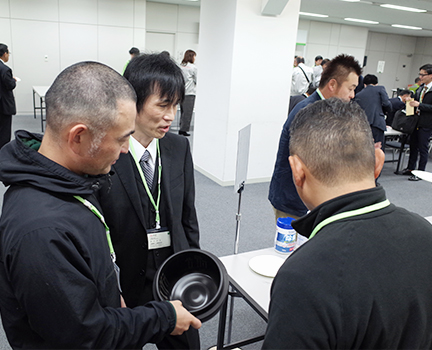 炊飯器に興味を持っていただいた参加者に、「炭釜」の魅力を解説する根岸。
