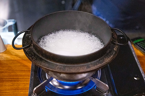 森山さん 基本は16時間浸漬させたお米をかまどにかけて5分で湯気を出させ、その後5-6分で火を引いて20分ほど蒸らします。一番大切なのは最初に湯気が出るまでの時間で、5分程度で湯気が出るところまで持っていきたい。ただ「はじめちょろちょろ~」と言うように、最初は火を控えめにして、お米から甘味と色気を引き出してから火力は全開にしたいですね。