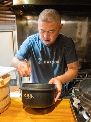 かまど✕羽釜✕薪という昔ながらの炊飯を実践するかまど炊き職人。「香り」「歯ごたえ」「甘み」というお米の旨みすべて引き出す。「圧力をかけずに硬めに炊いたごはんだと食感が得られる上、噛むうちに唾液も出て、よりうまみが感じられるようになります。ただずいぶん前からやわらかいごはんがもてはやされるようになりました。最近、硬めへの揺り戻しもありますね」。