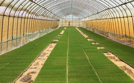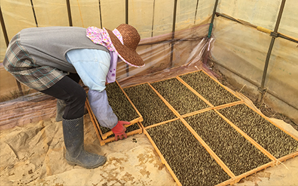 育苗ハウスで苗を育てます。土を入れた育苗箱に種まきをするのですが、種はあらかじめ選別して消毒作業を行います。土の上に種をまき、種の上にまた土をかけ、芽が出るまで温度や湿度を24時間ずっと管理し続ける必要があります。