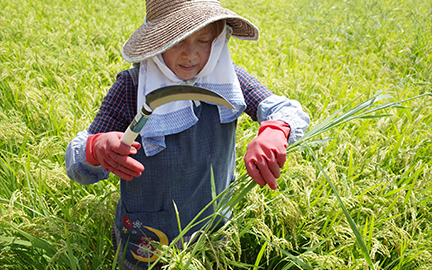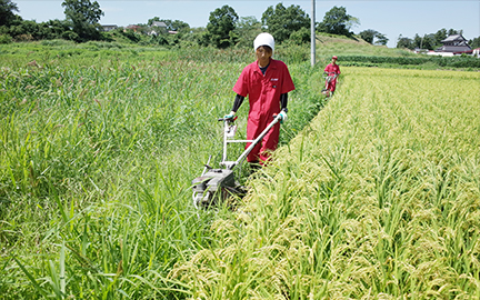 稲は水の中で生育するため、水管理がとても大切です。毎日の天候、気温に合わせて浅水、深水など田んぼの水深を調節します。また稲の生育中に害虫などから悪影響を受けないように、田植えから収穫の間に何度か草刈りを行います。機械や手作業で除草します。またこの時期に追肥(肥料を追加)したり、病害虫を防除したりと、稲の生育を進める作業を繰り返します。