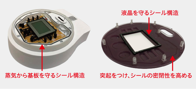 炊飯時には、釜の内部に蒸気が大量に発生するため、蒸気がふたの内側に入り込むことがあります。蒸気が基板に触れると回路の制御ができなくなり、故障に繋がる場合もあるのです。そこで基板の周囲にシール構造を施し、基板をガードする設計にしました。基板のみならず、液晶画面にも蒸気が入り込まないよう、液晶の周囲にもシール構造を採用。内部を密閉することで蒸気から基板と液晶を守ります。