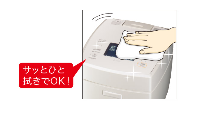 炊込みご飯後などのニオイも軽減。「お米/銘柄」ボタンを長押しすると、画像の液晶画面に切り替わり、お手入れモードに!