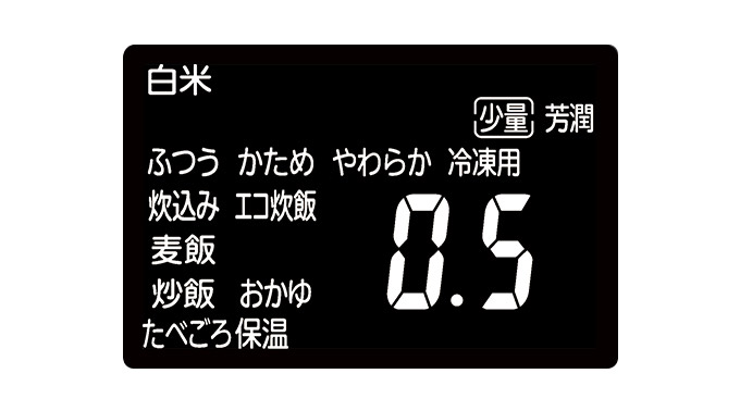 0.5~2合を0.5合単位に合わせた炊き方ができます。