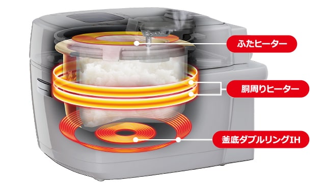 大容量のカートリッジで大火力でもふきこぼさず、「おねば」からうまみだけをごはんに還元。連続沸騰を実現。
