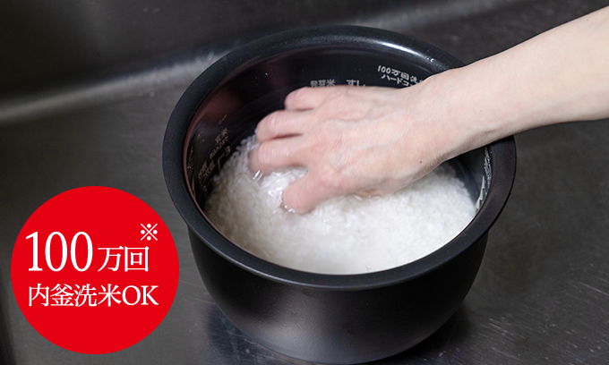 ※実使用時と同様、人の手による内釜洗米試験(白米2合を500回洗米するごとに米と水を取替え、100万回洗米)終了時、内釜内面コート(フッ素加工)のはがれ検出無し(当社調べ)。