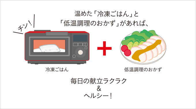 温めた「冷凍ごはん」と「低温調理のおかず」があれば、毎日の献立がらくらく、ヘルシーに。