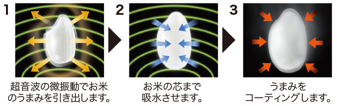 超音波振動で吸水を促し、浸け置きなしでも、ふっくら炊けます。