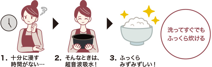 浸け置きなしでも、ふっくら。「可変超音波吸水」