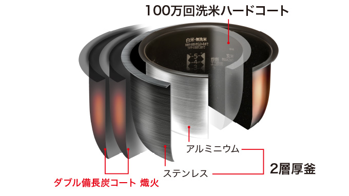 2層厚釜をダブル備長炭コートすることで、大火力を実現。「炭」の力でごはんをふっくら炊き上げます。