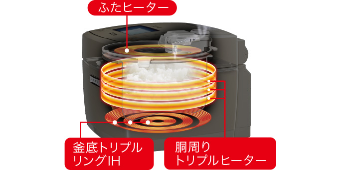 全方向から内釜を包み込む七重のヒーターで、お米全体に熱を伝え、しっかりと粒感を立たせます。
