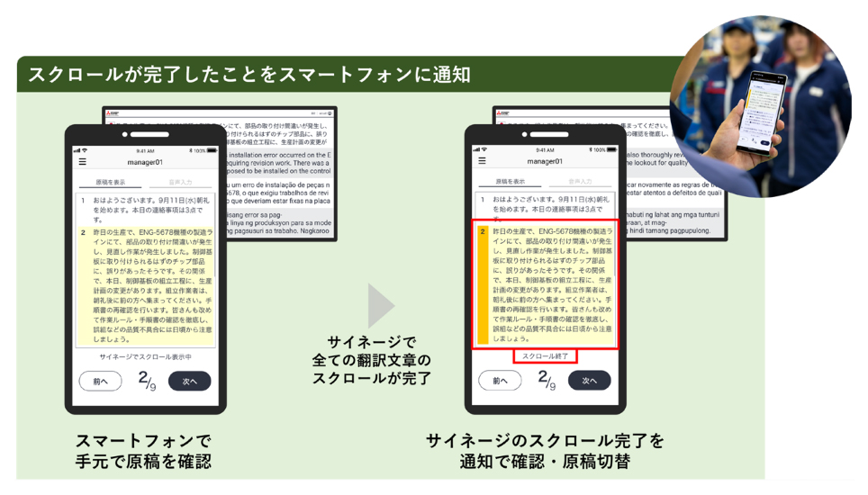 - サイネージに表示される全ての翻訳文章のスクロールが完了したことをスマートフォンに通知することで、班長やリーダーはサイネージ画面を確認することなく、次の話題への切り替えが可能。