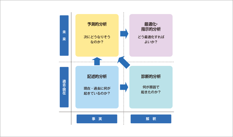 そして、それが起きた原因を探ります。過去の事象が起きた因果関係が分かれば、別の条件の時にどんな結果になるかが予想できます。最終的には、最適化分析によって、自分たちにとって好ましい結果になるにはどうすれば良いかという改善策を見出すことができます。例えば、ある製品が売れたという事実から分析をスタートして、なぜ売れたのか、どうすればもっと売れるかという最適化を目指します。
