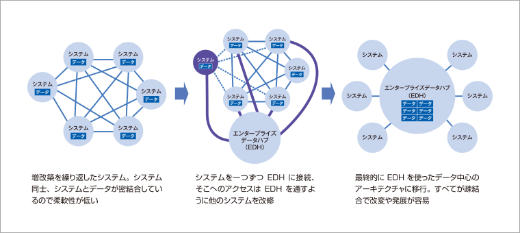 まず、既存のシステムを維持したまま、新たにEDHを作ります。そして、まず既存システムの中から一つをピックアップしてEDHに接続します。次に、このシステムとデータをやりとりする他のシステムは、必ずEDH経由でデータを取得するように変更します。もちろん、今後追加する新しいシステムも、このEDHに接続することになります。