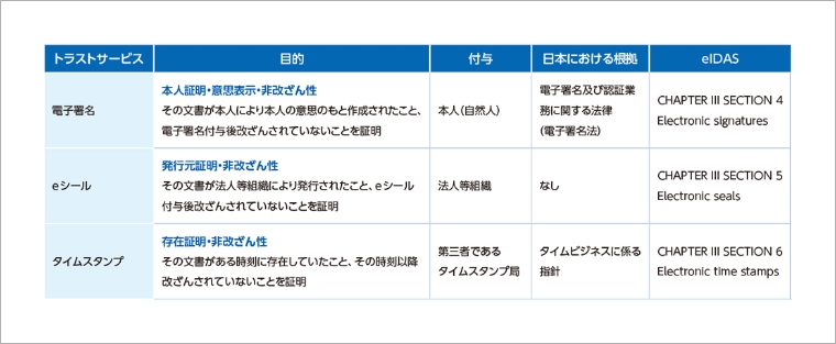 EUでは2016年施行の「eIDAS(イーアイダス)規則」によってこれらのトラストサービスに法律的な効力を与え、サービスを提供する事業者の認定なども行っています。これにより、EU域内ではeシールによる正当性の証明に法的な効力があります。