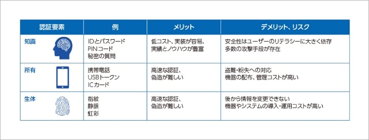 この中から種類の異なる認証要素を組み合わせることで安全性が高まります。例えば、パスワードという「知識」だけの認証では、いったん情報が漏れれば簡単に認証を突破されてしまいます。また、ICカードの「所有」だけでも現物を盗みだせば認証を通過できます。しかし、パスワードとICカードを組み合わせた認証では、ICカードを盗み出したうえでパスワードも知る必要があり、なりすましのハードルが高くなります。