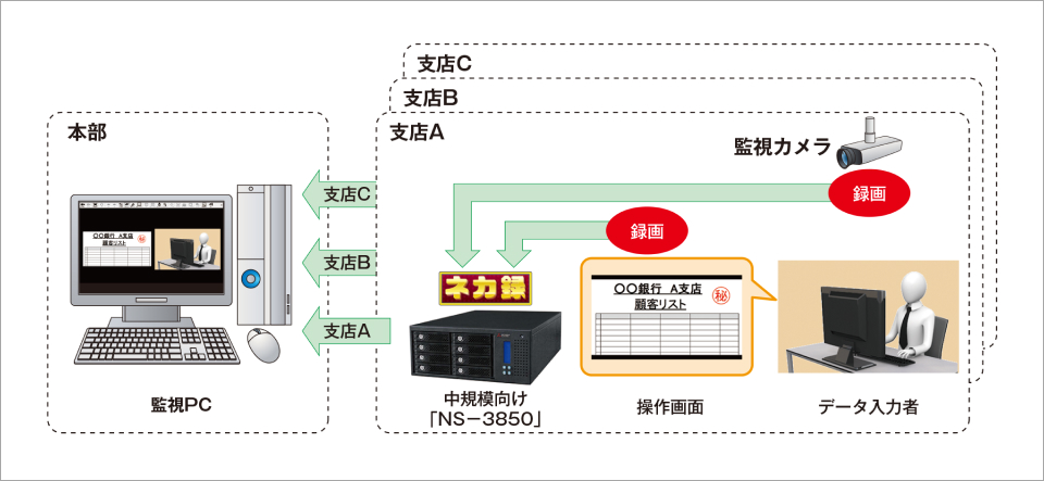 振込処理や入金処理などを担当する職員の行動をカメラで撮影するとともにPCの操作画面を一緒に録画することで、内部統制の強化に貢献します。