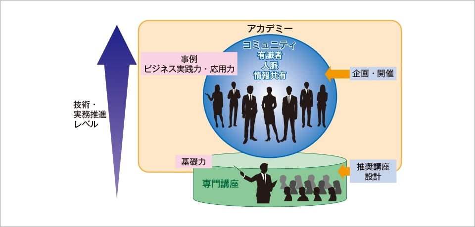 同アカデミーの特徴は、専門知識を学ぶ講座と専門家同士が情報共有を行うコミュニティ活動の2つを組み合わせている点です。