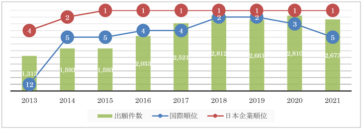 2021年の企業別国際特許出願件数において日本企業で第1位