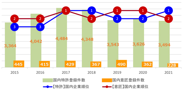 2021年の企業別 国内特許登録件数で第1位、国内意匠登録件数で第2位