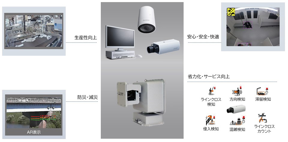 ネットワークカメラ・システムは、映像記録・監視だけではなく、AIや映像解析技術を活用し、不審物の早期検知による安全性の向上、混雑度合いや人の流れの検知による快適な空間の提供、防災・減災などにも用途を広げています。多様なニーズにお応えする「MELOOK」シリーズや、公共設備などの広域監視に最適な製品の提供を通じて、安心・安全な街づくりに貢献します。