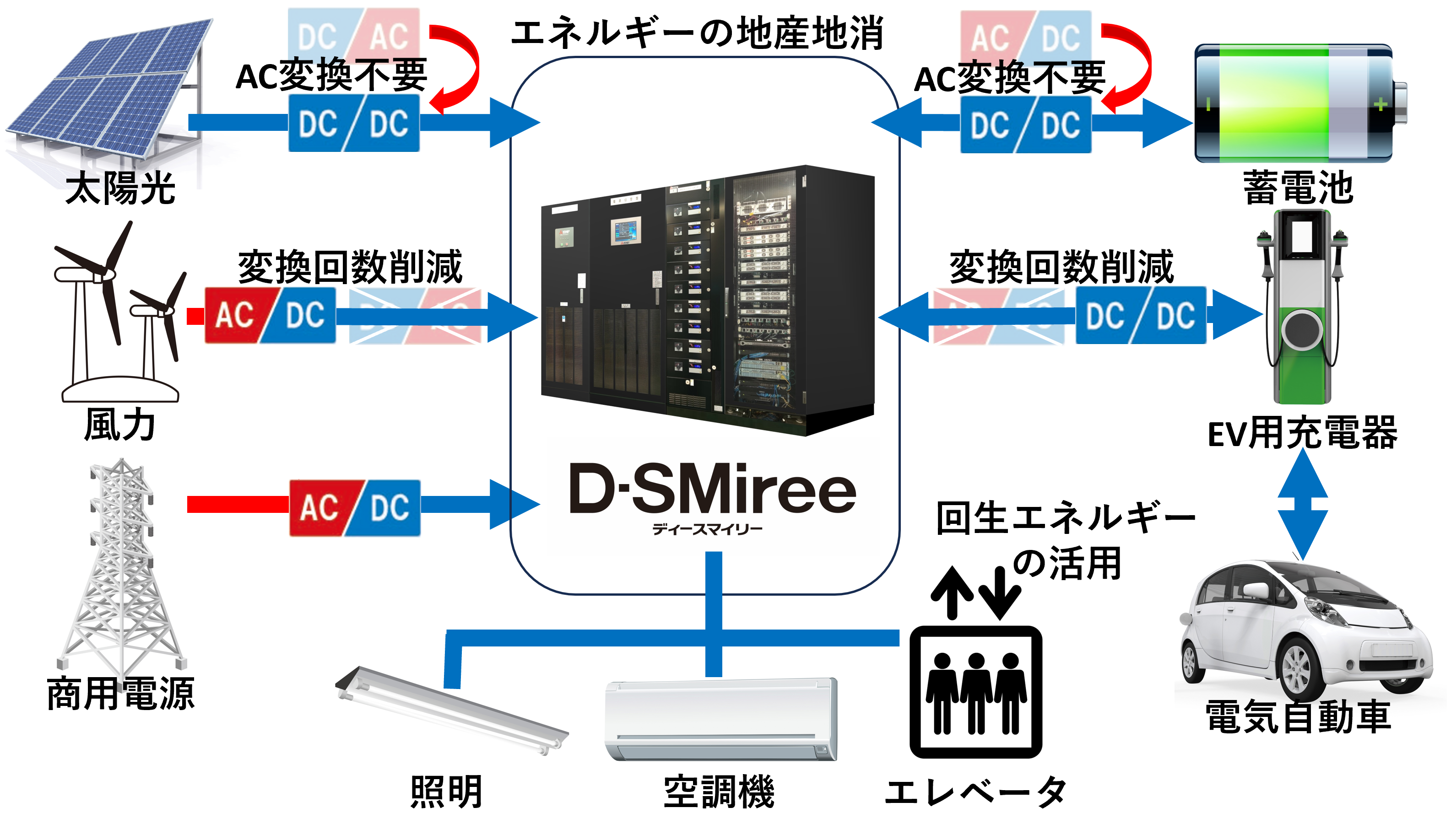 風力・太陽光発電所等の再生可能エネルギーの発電適地と電力消費地は離れており、送電過程で周波数や電圧変換によるロス、送電ロスが発生します。これらを低減し電力を安定的・効率的に利用する手段の一つに直流送配電技術があり、三菱電機は高電圧直流送電(HVDC)システムや、地産地消の電力システムの構築に有効な中低圧直流配電ネットワークシステム(D-SMiree)を展開するとともに、電力系統を保護する直流遮断器を開発中です。これらの直流技術を通じて、再生可能エネルギーの更なる普及とカーボンニュートラルの実現に貢献します。