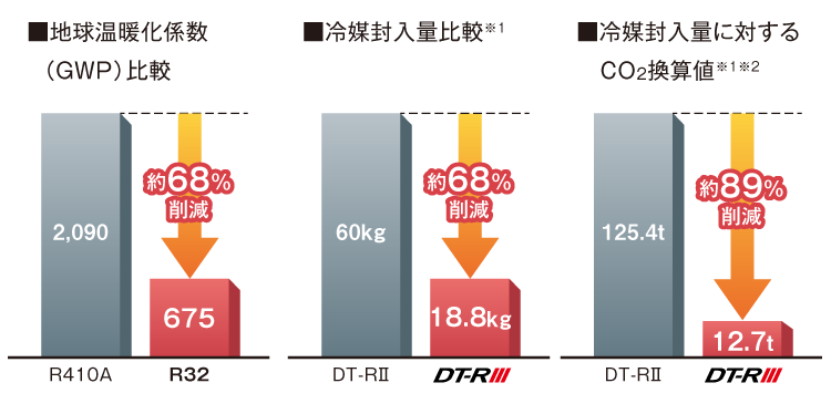 従来シリーズで採用しているR410A冷媒と比較し地球温暖化係数(GWP)が約1/3のR32冷媒を採用。さらに、従来シリーズに比べ冷媒封入量を約68%削減し、冷媒封入量に対するCO2換算値を約89%削減。地球環境に与える影響を大幅に低減しました。