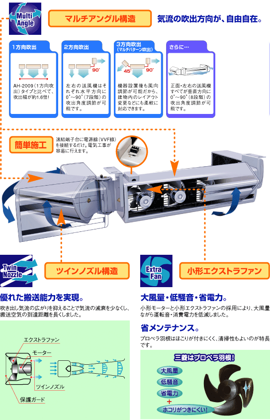 1方向だけでなく、3方向に気流の吹出しが可能。複雑に入り組んだ空間などに最適なだけでなく、建物内のレイアウト変更にも柔軟に対応できます。地下駐車場の排ガス搬送をはじめ、工場・倉庫内の換気補助や大空間のサーキュレーションなど、さまざまな用途で威力を発揮します。