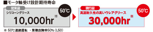 ウレアグリースの採用により、軸受寿命を従来品比約3倍(10,000hrから30,000hr※)に向上。本体およびモータの交換回数の削減が可能となりました。