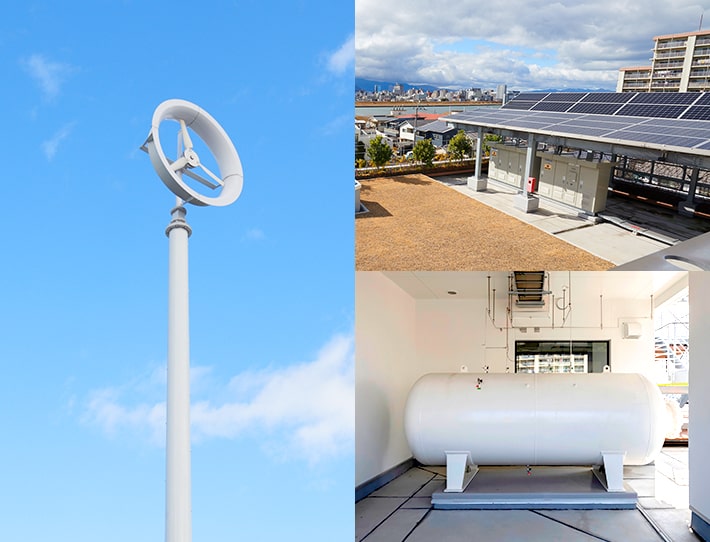 グリーン水素利用の純水素発電や風力発電も備えており、3階の倉庫には食料も備蓄してあります。もしもの災害時には外付けの階段が屋上へあがることのできる経路となっているため、住民の皆様が避難できるBCP対策ビルとしても対応可能な作りです。