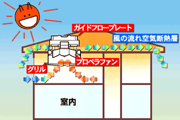 「換気排熱ファン」は、住宅に風の流れを作り、屋根裏・天井の熱気を排出。これにより、屋外の空気を取り込み、室内温度を下げる事が可能です。また、冷房期間中のエアコン負荷の軽減も可能です 。