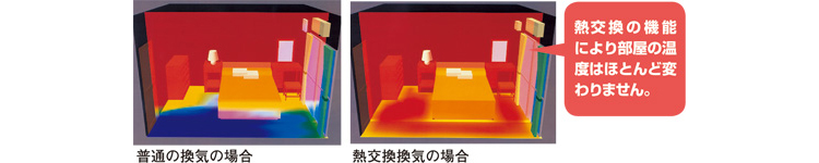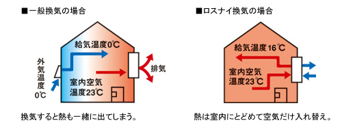 ロスナイ換気は室内の暖かさを再利用しながら換気するので、一般(非熱交換)換気に比べ熱損失を抑えることができます。