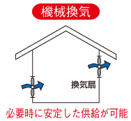 換気扇などの機械の力により強制的に室内の空気の入れ替えを行う。人が快適に暮らす家を建てる場合は、「機械換気」が有効。