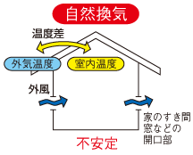 外風や、室内と外の温度差などの自然環境を利用して室内の空気の入れ替えを行う。