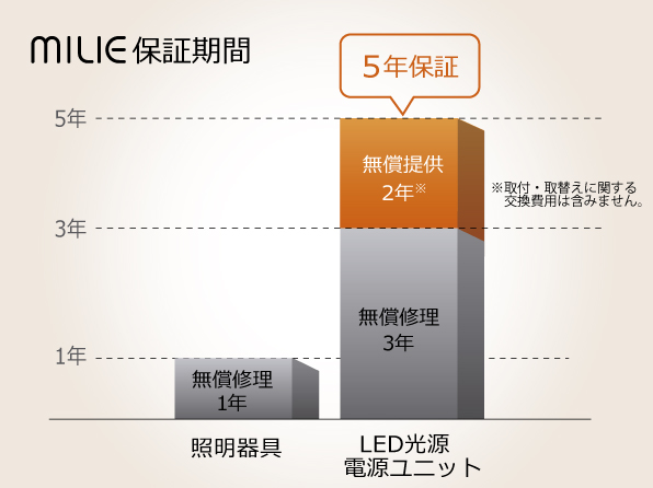 LED光源、電源ユニットは5年間の長期保証。独自の厳しい品質基準により開発・製造した高品質の製品を提供する三菱だからできるメリットです。長く安心してお使いいただけます。